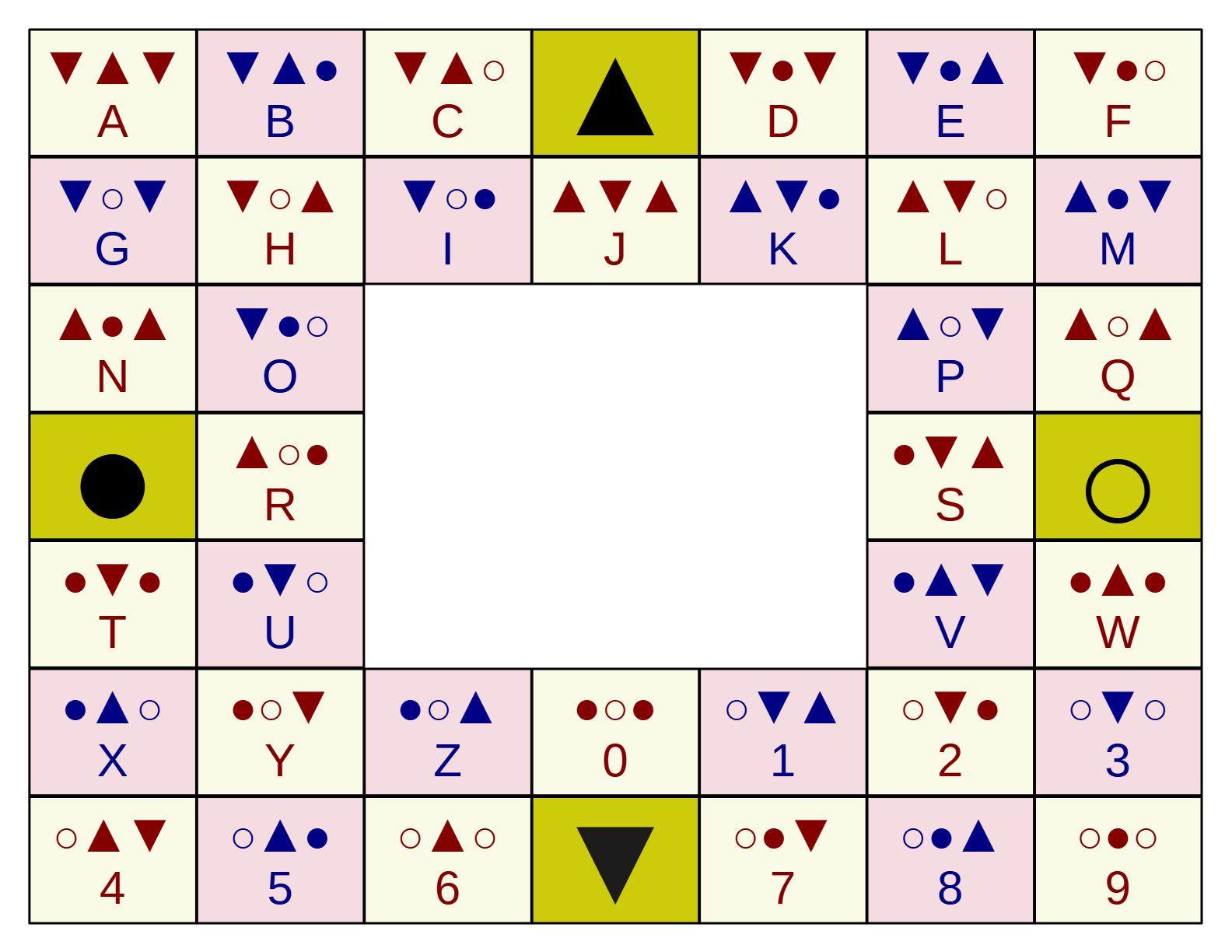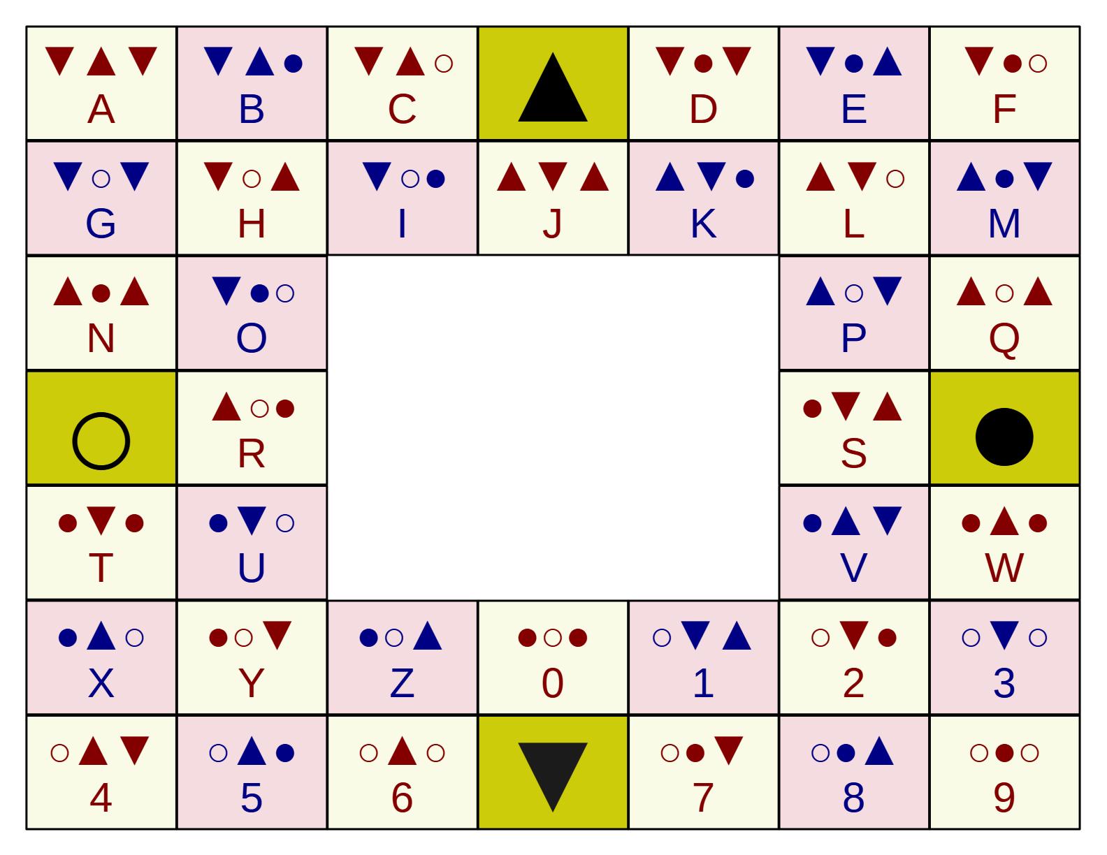 I believe I have come up with a system for eye-gaze communication which is an improvement over the traditional spelling card. It uses strings of three quaternary symbols instead of the eight directions that the spelling card uses. I am calling them Up, Down, Black, and White to get around the problem of forever having to mentally transpose left and right between communicators. I think for testing and training purposes and really, what will probably get used more than using it for spelling it would make the most sense to start with it as a menu of TV and radio channels, bands, albums, movies, podcasts, or YouTube channels… You get the picture.